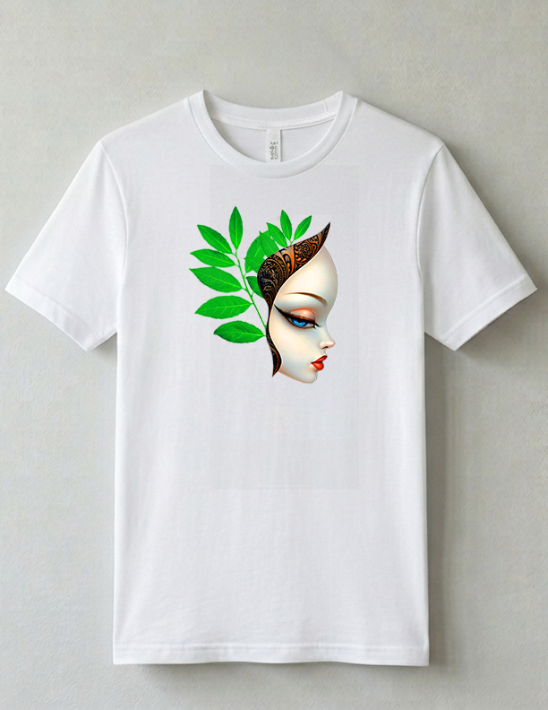 Ethereal portrait of a woman in profile, adorned with lush green leaves woven through her hair. Soft, natural makeup enhances her delicate features while botanical elements create a serene, nature-inspired aesthetic. Perfect for design projects, wall art, or creative inspiration. High-resolution digital download ready for print or digital use. ALL Our T shirts Are %100 Cotton .